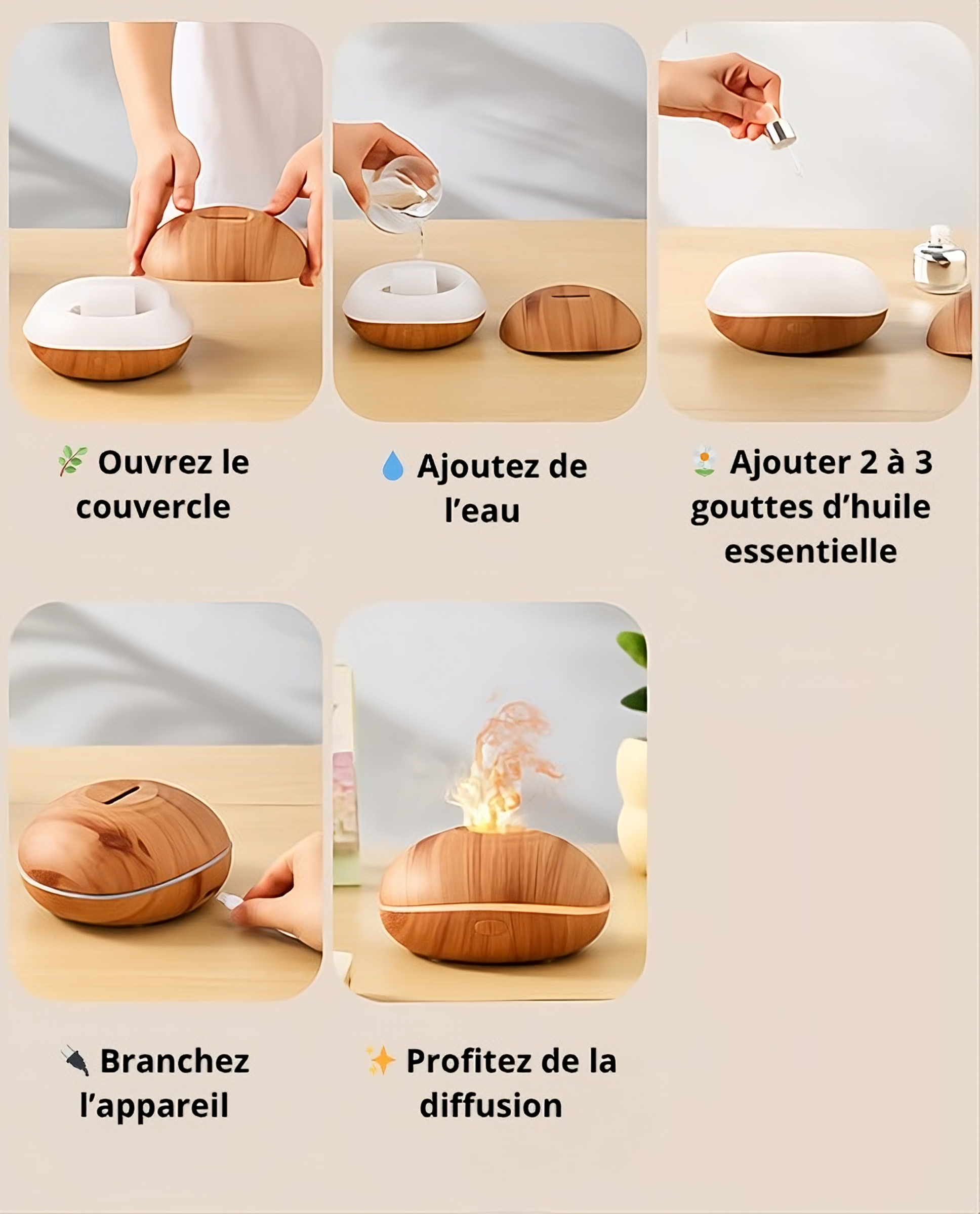 Soulevez le couvercle, ajoutez de l’eau et quelques gouttes d’huile essentielle.